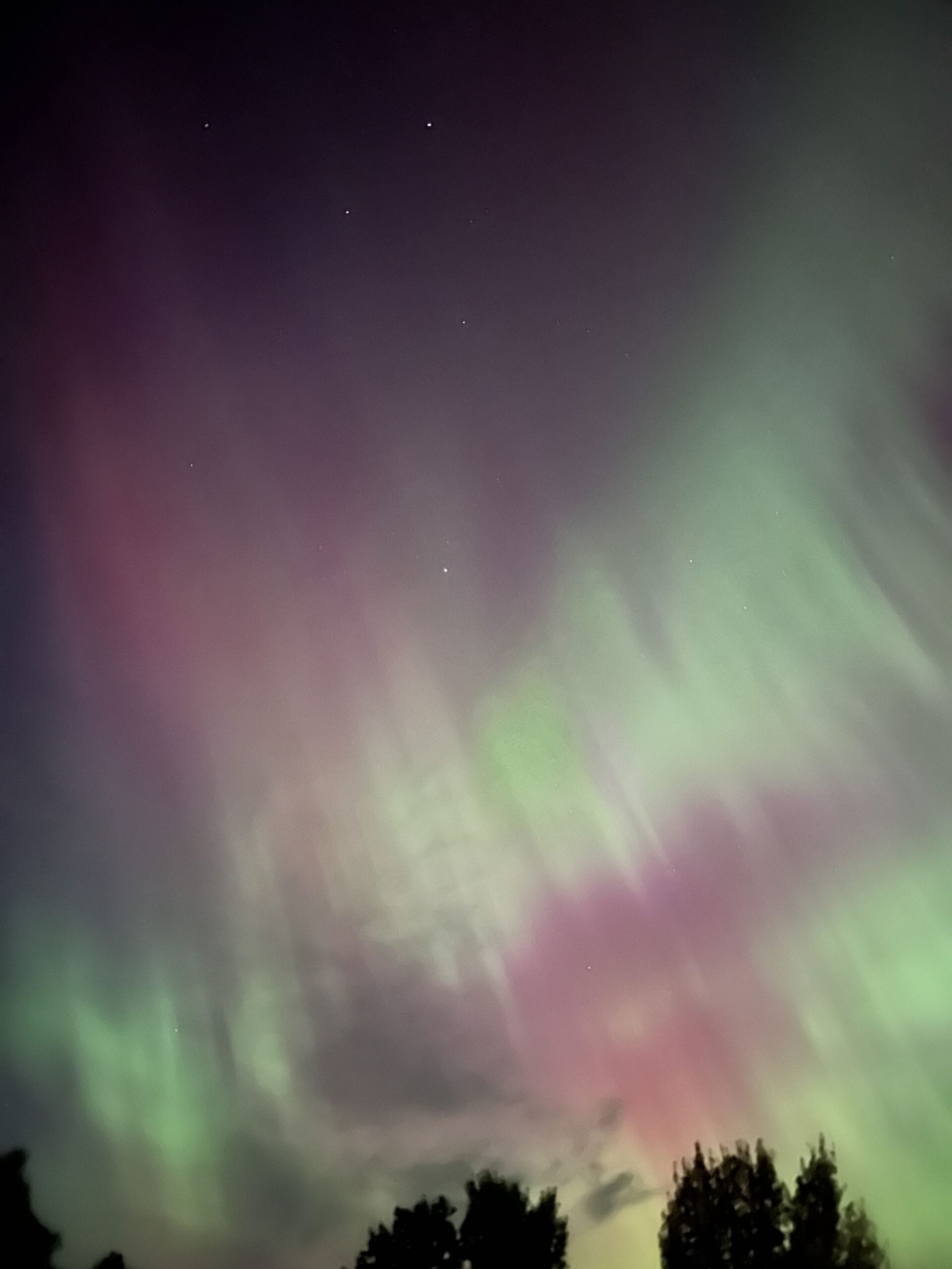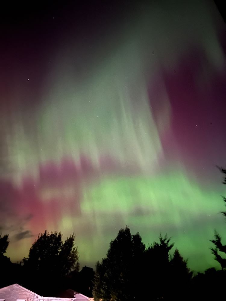 According to an article from The Weather Network: “The auroras were caused by strong geomagnetic energy due to a coronal mass ejection (CME) impacting Earth’s magnetic field. The National Oceanic and Atmospheric Administration (NOAA) revealed that Sunday night’s magnetic storms were measured at G3 (strong), with a K-index of 5 to 7, indicating these were strong and vibrant storms.”