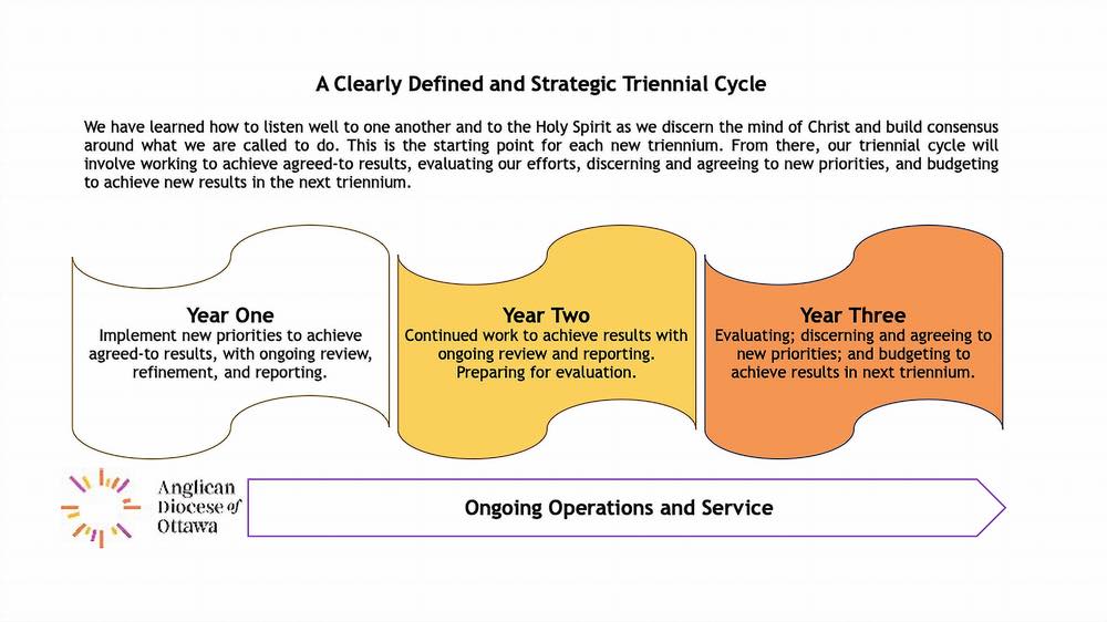 In recent years, we have learned how to listen well to one another and to the Holy Spirit as we discern the mind of Christ and build consensus around what we are called to do. This is the starting point for each new triennium. From there, our triennial cycle will involve working to achieve agreed-to results, evaluating our efforts, discerning and agreeing to new priorities, and budgeting to achieve new results in the next triennium. I look forward to working with Diocesan Council to fully implement our new triennial cycle.