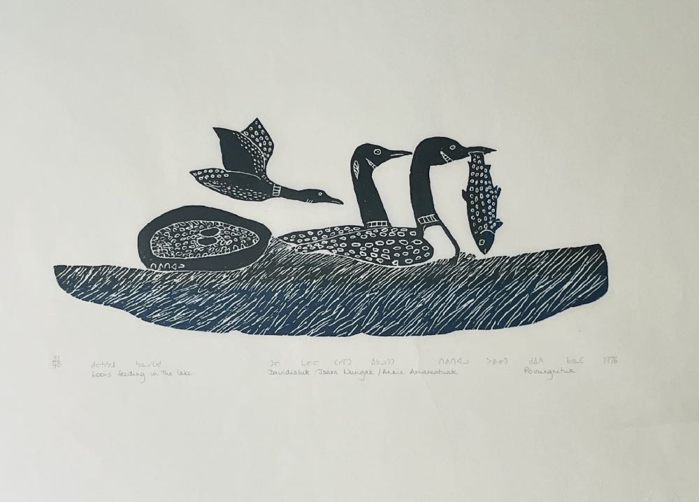 St. Matthew’s recently received the donation of seven stunning stonecuts from Povungnituk, which is located along the eastern shores of Hudson Bay in Nunavik (Arctic Quebec). Printmaking started there in 1961 as a project of the Povungnituk Cooperative, and annual print collections were shown from 1962 until 1989 when the print shop closed after the death of several prominent graphic artists.