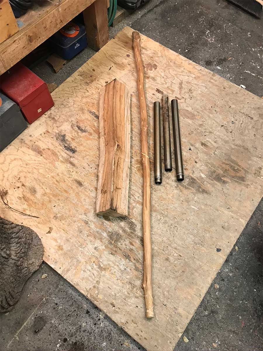 The staff in the centre of the raw materials was cut in 1978 on the Carp Ridge, between the villages of Dunrobin and Carp. My brother Barry and I were hired to build a cedar log cabin, and a number of young ironwood trees on the site had to be cleared—and one of them became my walking staff. Barry and I lived in tents at the cabin site for many weeks, and the staff remained with me as a memento of those days.