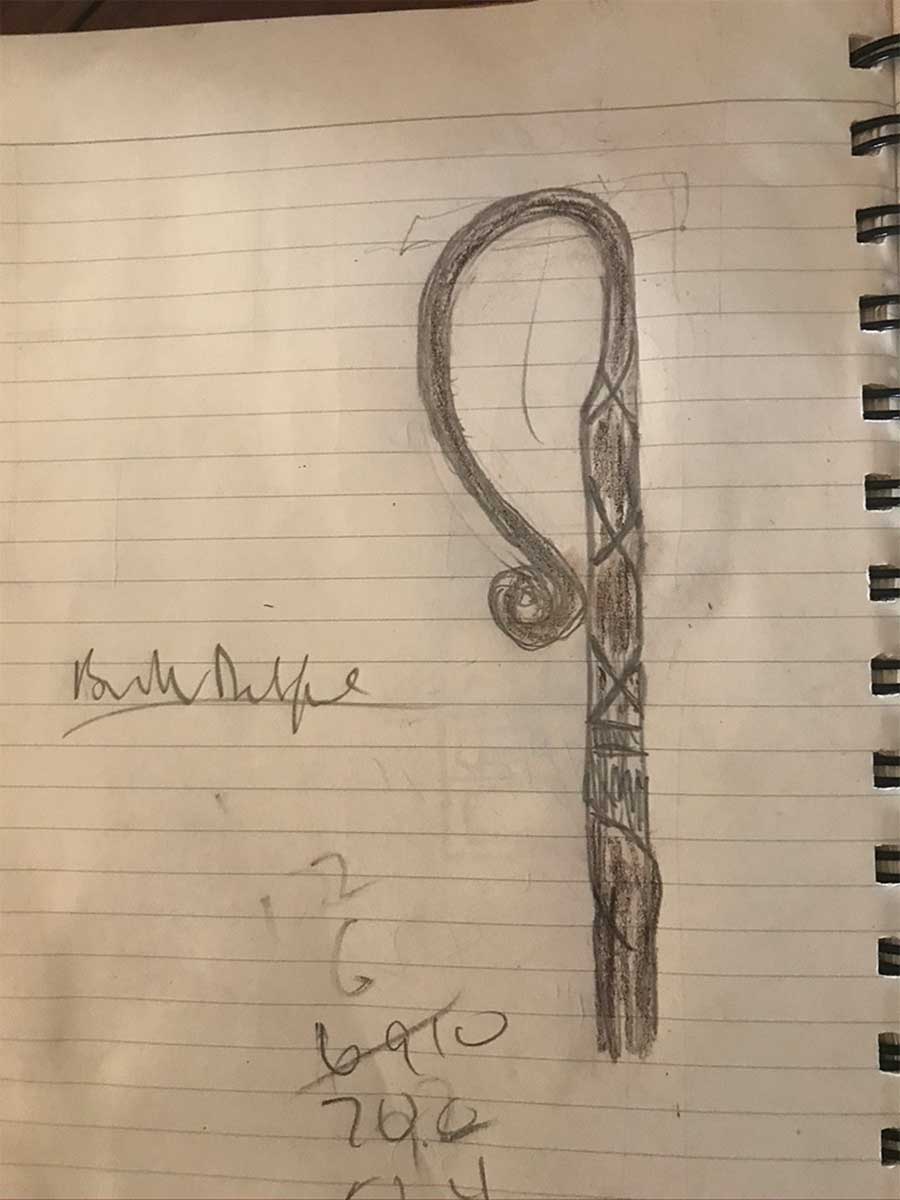 In the three pictures accompanying this column you can see the quick sketch of what the crozier was to look like, the raw materials laid out on the floor of my shop, and the finished product. The scrawl on the sketch says “Brother Thankful” because that is my crozier’s name—and here is why.